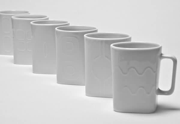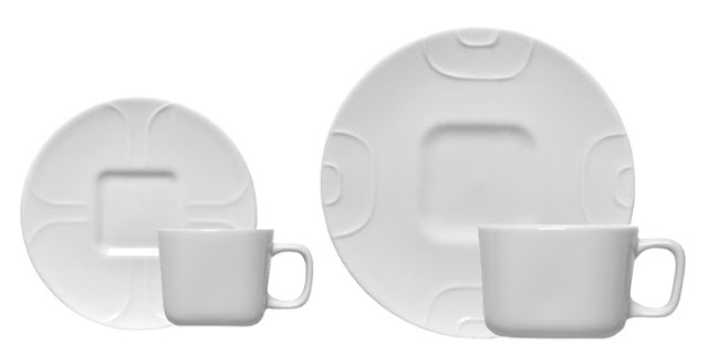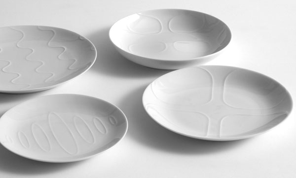 Piatti bianchi di porcellana, oggetti all’apparenza troppo semplici, quasi banali, ma che nascondono segni grafici che definiscono la loro superficie.Collezione Opti di Setsu & Shinobu Ito.