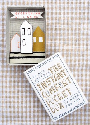 Il lunedì è sempre una giornata tragica!Ricominciare con la solita routine, lavoro, casa,famiglia e pensare con nostalgia al week end passato, tutte cose che possono abbatterci e farci passare il buon umore.Per darci la carica e strapparci un sorriso arrivano le piccole scatoline di cartone dell’illustratrice olandese Kim Welling, che assomigliano in tutto e per tutto alle care vecchie scatole di fiammiferi, ma che nascondono al loro interno dei piccoli messaggi con disegni tridimensionali.Le “Instant Comfort Pocket Box” sono perfette per incoraggiarsi, per ricordarci che andrà tutto bene e per augurarci una bellissima giornata.Simpatiche no?