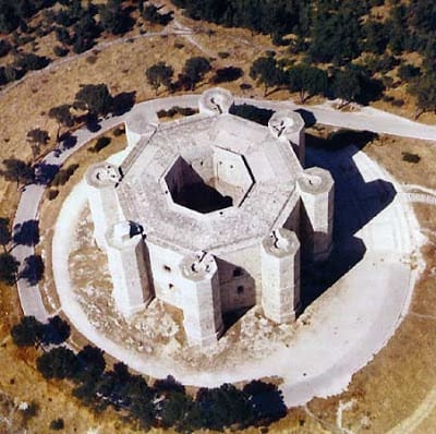 C’è poi l’enigmatico Castel del Monte in Puglia, una costruzione ancora oggi piena di misteri,un edificio che sembra essere più un simbolo, un monumento,un tempio piuttosto che luogo di difesa, perchè privo di molti elementi caratteristici di un castello, come fossati e sotterranei.Castel del Monte è famoso per la sua forma ottagonale, presente sia nella pianta della costruzione principale sia nelle otto torri, tutte le costruzioni sono molto attente alle proporzioni matematiche, ai numeri, tanto che alcuni rapporti sono spesso ripetuti nella progettazione del castello. Il portale di ingresso principale si apre sulla parete della struttura ottagonale orientata esattamente ad est, rivolta proprio verso nel punto in cui sorge il sole in coincidenza degli equinozi di primavera e d’autunno. Sulle due colonne che fiancheggiano la porta inoltre sono accovacciati due leoni, quello di destra guarda verso sinistra, quello di sinistra guarda verso destra, in altre parole i loro occhi sono rivolti verso i punti dell’orizzonte in cui sorge il Sole alle date dei solstizi d’estate e d’inverno.