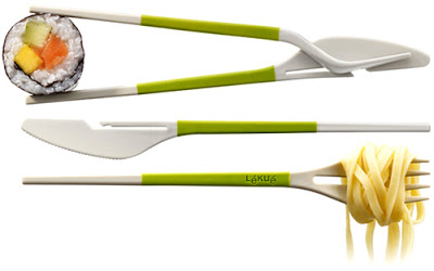 Uno dei problemi per gli appassionati del sushi è quello di non avere molta dimestichezza con le bacchette, riusciamo si a prendere le nostre composizioni di pesce e riso, ma se si tratta di qualche altro piatto, qualcosa di più complicato come gli spaghetti di soia, bè allora le cose si fanno decisamente difficili. Per chi come me ha spesso dei problemi, ecco le posate ideali, perfette per tutti i piatti e tutte le situazioni: le posate “Twin One” ideate dai fratelli Adrian e Jeremy Wright dello studio DesignWright. Questa nuova posata progettata per il marchio spagnolo Lékué, riesce a mixare in modo intelligente occidente ed oriente, una forchetta e un coltello si incastrano per dar vita ad un perno che trasforma le classiche posate in comode bacchete cinesi.In questo modo basterà smontare le bacchette per utilizare la forchetta e con la stessa facilità rimontare le posate per le pietanze orientali. Il tutto unito ad uno stile semplice, minimale con tocchi di colore.Geniali.