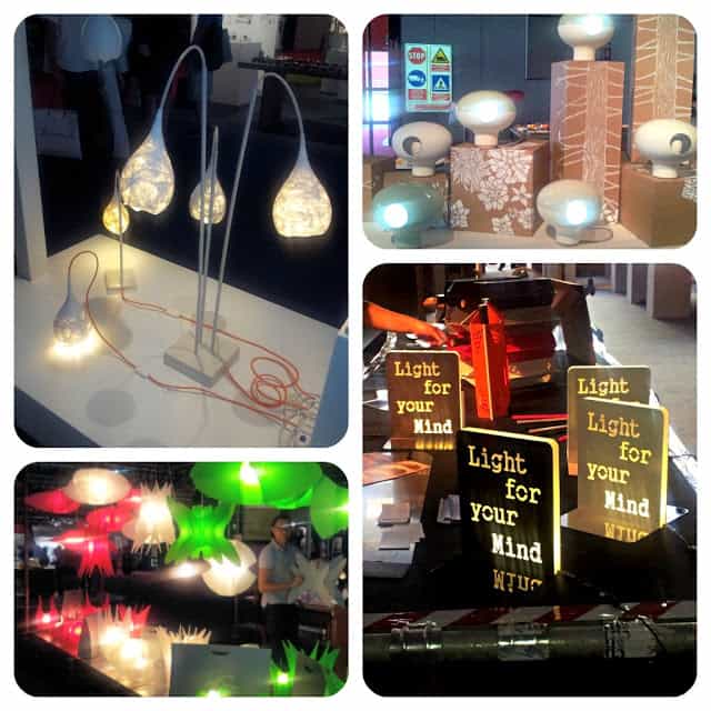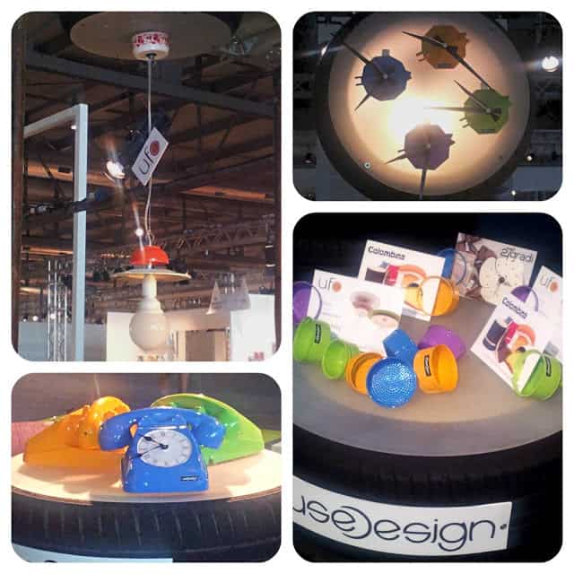 Lo stand di Usedesign con i loro prodotti nati dal riciclo di vecchi oggetti recuperati e trasformati.