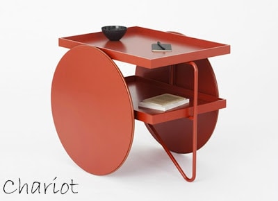 “Chariot” mi ha subito conquistato:un carrellino davvero unico e particolare, una struttura in metallo minimale, due vassoi in mdf laccato e due grandi ruote che danno carattere a tutto l’insieme.