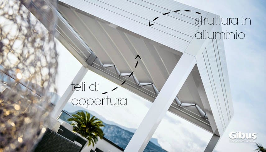 Alla struttura fissa in alluminio è affiancata la copertura mobile, una serie di teli studiati per proteggere dalla pioggia o dall’esposizione solare e che possono assumere diverse configurazioni a seconda delle proprie esigenze.