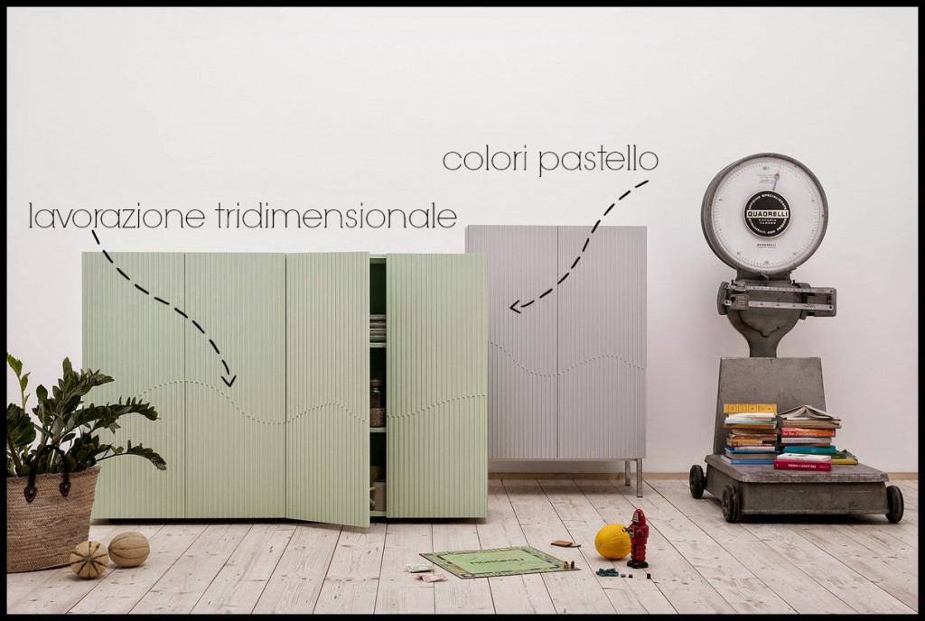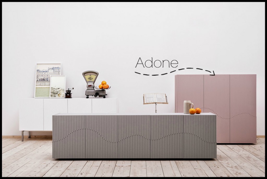 Un’altra collezione di madie e un’altra lavorazione tridimensionale:ecco Adone. Progettate dallo stesso designer autore di Dorotea, Claudio Lovadina, questi arredi hanno una linea più delicata, colori pastelli uniti ad una serie di incisioni sui rivestimenti delle ante che generano un gioco geometrico, un disegno sinuoso che conferisce unicità e carattere a questa nuova collezione.
