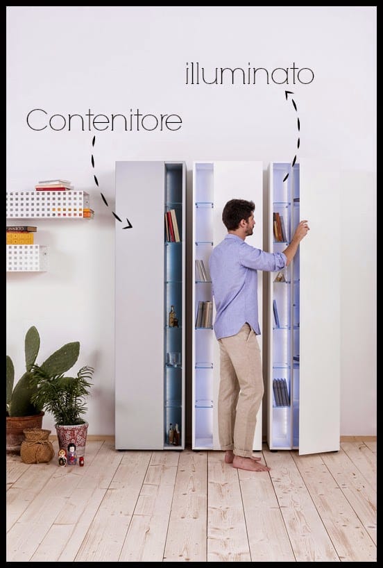 Da una parte infatti vediamo un anta ideata per nascondere al suo interno comodi ripiani, dall’altra parte invece trovano posto una serie di leggeri e delicati piani di cristalli. Una serie di led colorati possono all’occorrenza fare luce all’interno del mobile o illuminare i piani di cristalli, mettendo in evidenza gli oggetti posizionati su di essi e creando un’interessante lama di luce colorata.