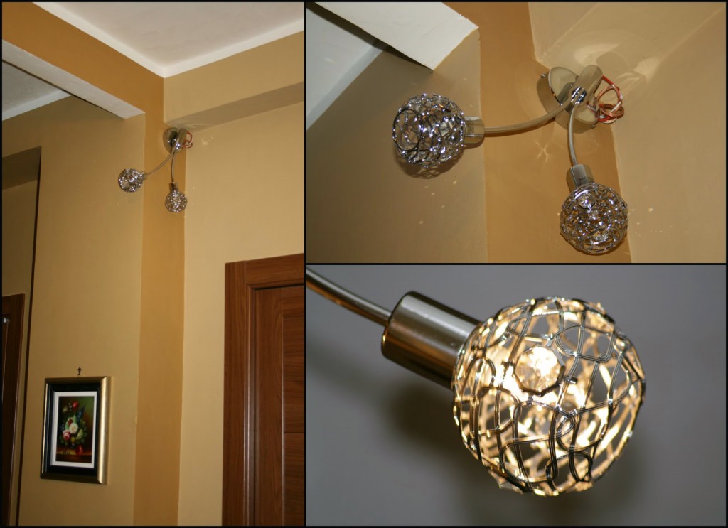 Ed ecco il risultato una volta montati i lampadari: finalmente sono spariti i fili penzolanti e al loro posto si vede la nuova lampada a muro, due punti luci che decorano la parete e illuminano la stanza e parte del corridoio.