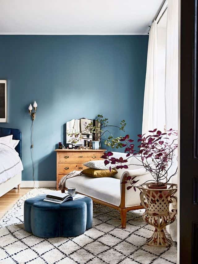 Pochi accessori, pareti quasi spoglie, dipinte con una raffinata sfumatura di blu (sono state proprio queste pareti a farmi cliccare su queste immagini, è una sfumatura di colore che sto valutando di poter usare presto).