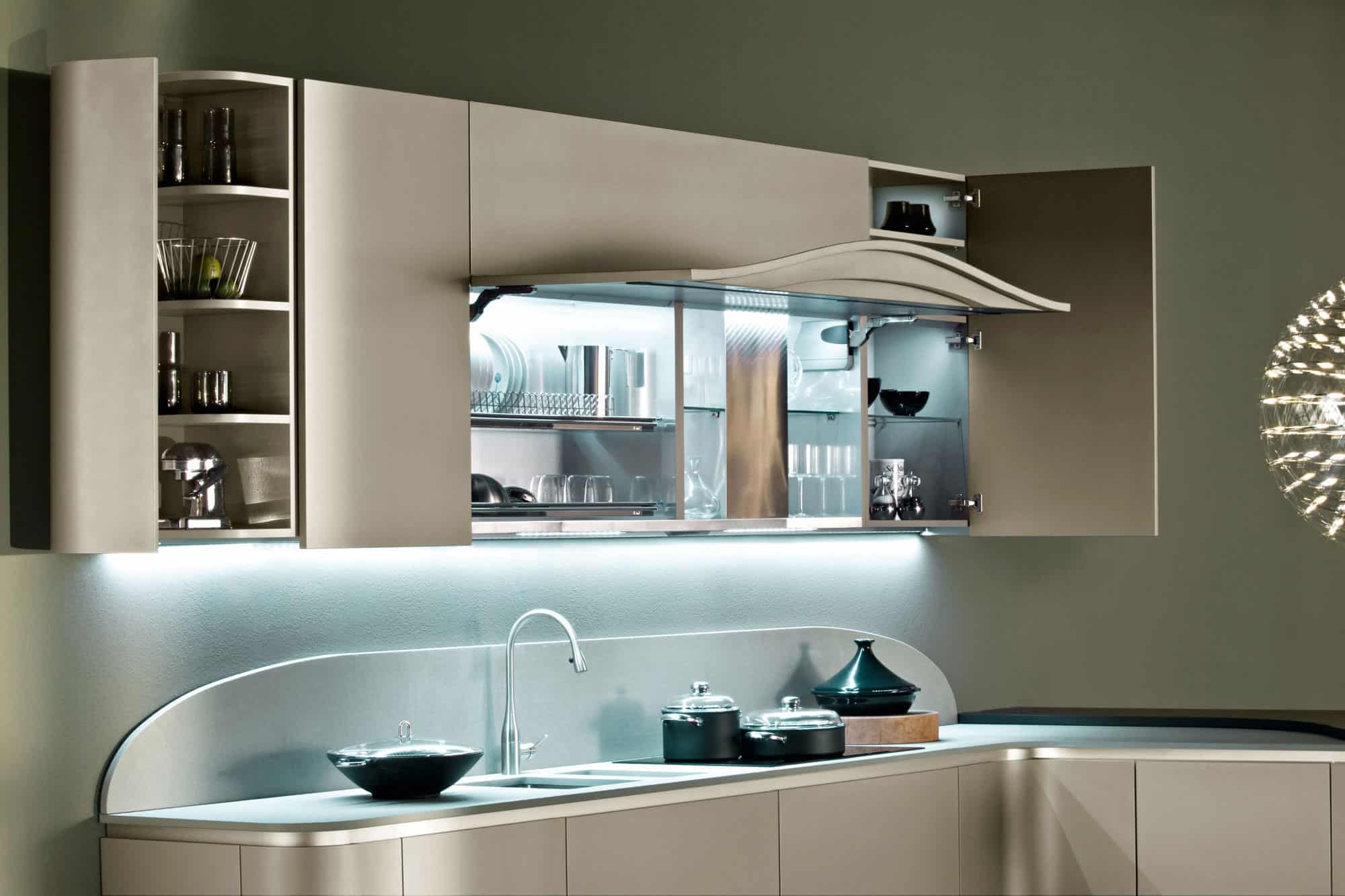 Perfetto abbinamento con le linee sinuose e originali del modello Ola20: tutti gli elementi terminali e angolari di basi ed armadi si caratterizzano per la loro curvatura che impreziosisce il disegno della cucina, garantendone una fruizione ergonomica e sicura.