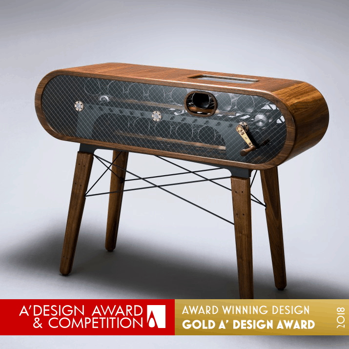 Un tavolo assolutamente unico e particolare: legno di noce e compensato di betulla fanno da rivestimento ad una complessa serie di ingranaggi, cuore di questo mobile che permette di scegliere e prendere il vino più adatto per la serata.