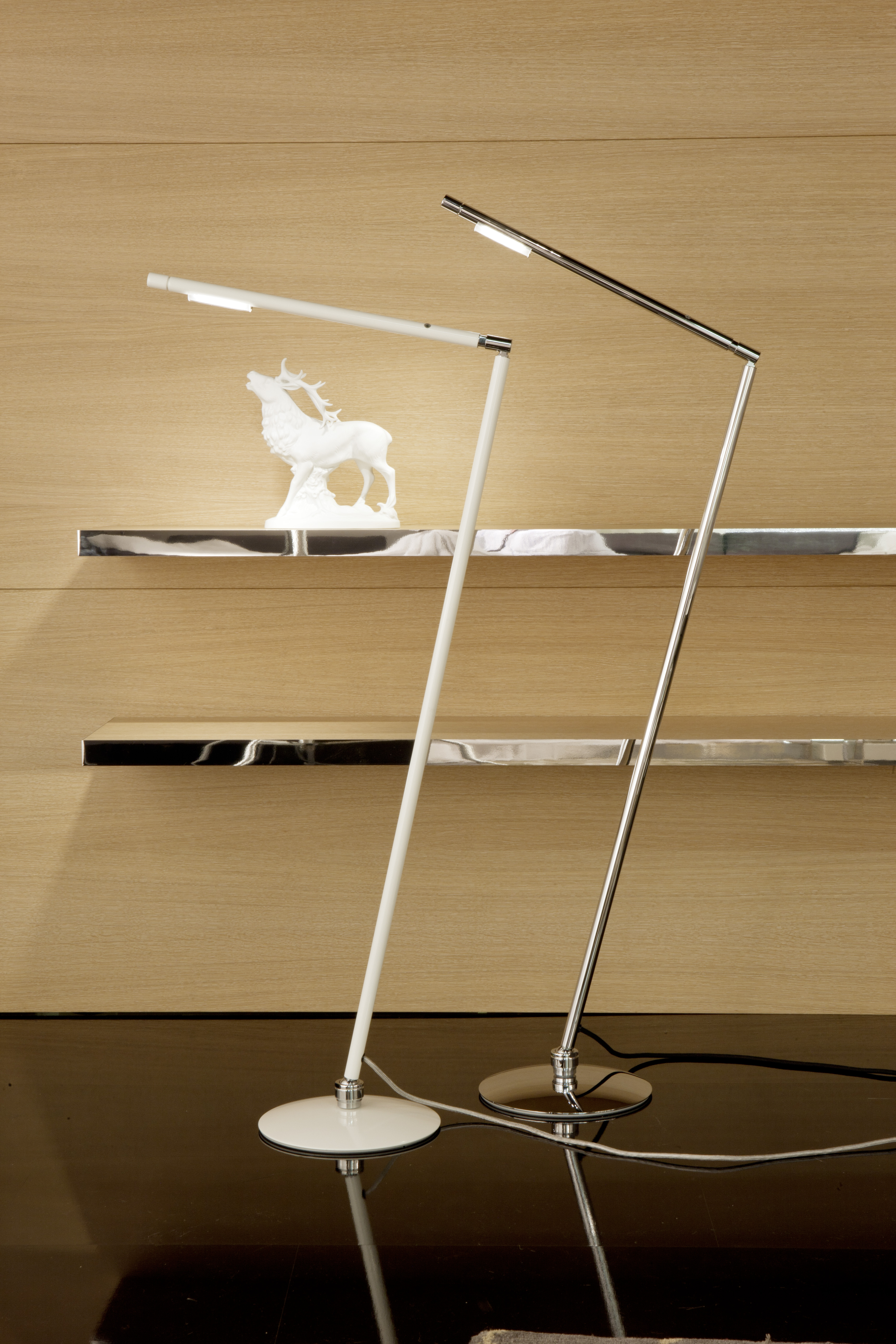 Realizzata in alluminio lucidato con giunti in cromo, Tubi è disponibile in due differenti formati:lampada da terra e lampada da tavolo.