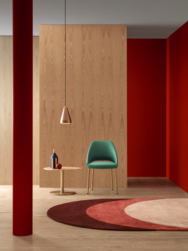 A destra Vic, del designer francese Patrick Norguet, una sedia dalla linee morbide ad avvolgenti, abbinata al tavolo Inox che quest’anno festeggia lo speciale anniversario dei 20 anni dalla sua presentazione, e la lampada a sospensione Tamara di Basaglia Rota Nodari.
