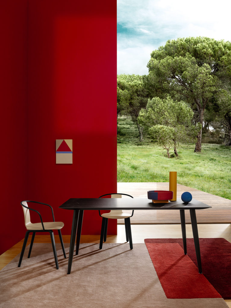che riprende la memoria delle curve morbide e sinuose delle sedie in legno della seconda metà del XIX Secolo, e il tavolo Fluxo di Luca Casini.