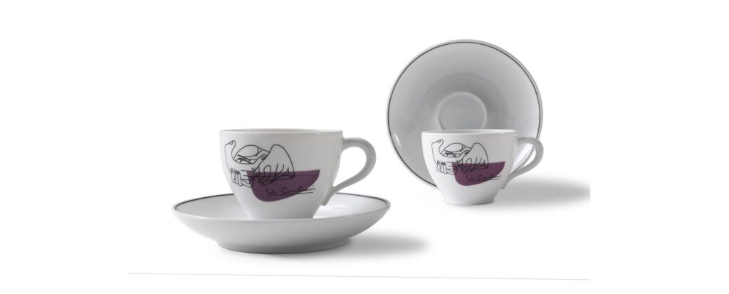 Un servizio da tavola realizzato in porcellana bianca, impreziosita dall’applicazione a mano del disegno originale di Le Corbusier, e comprende piatto piano, piatto fondo, piattino da dessert e tazza da caffè con piatto.