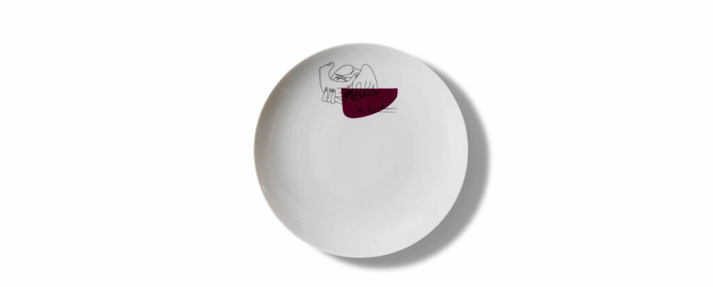 Nasce così Service Prunier: un servizio da tavola molto semplice, raffinato, caratterizzato da un preciso decoro, un tocco di colore prugna per l’area dove le tre mani intrecciate e la firma inconfondibile di Le Corbusier.