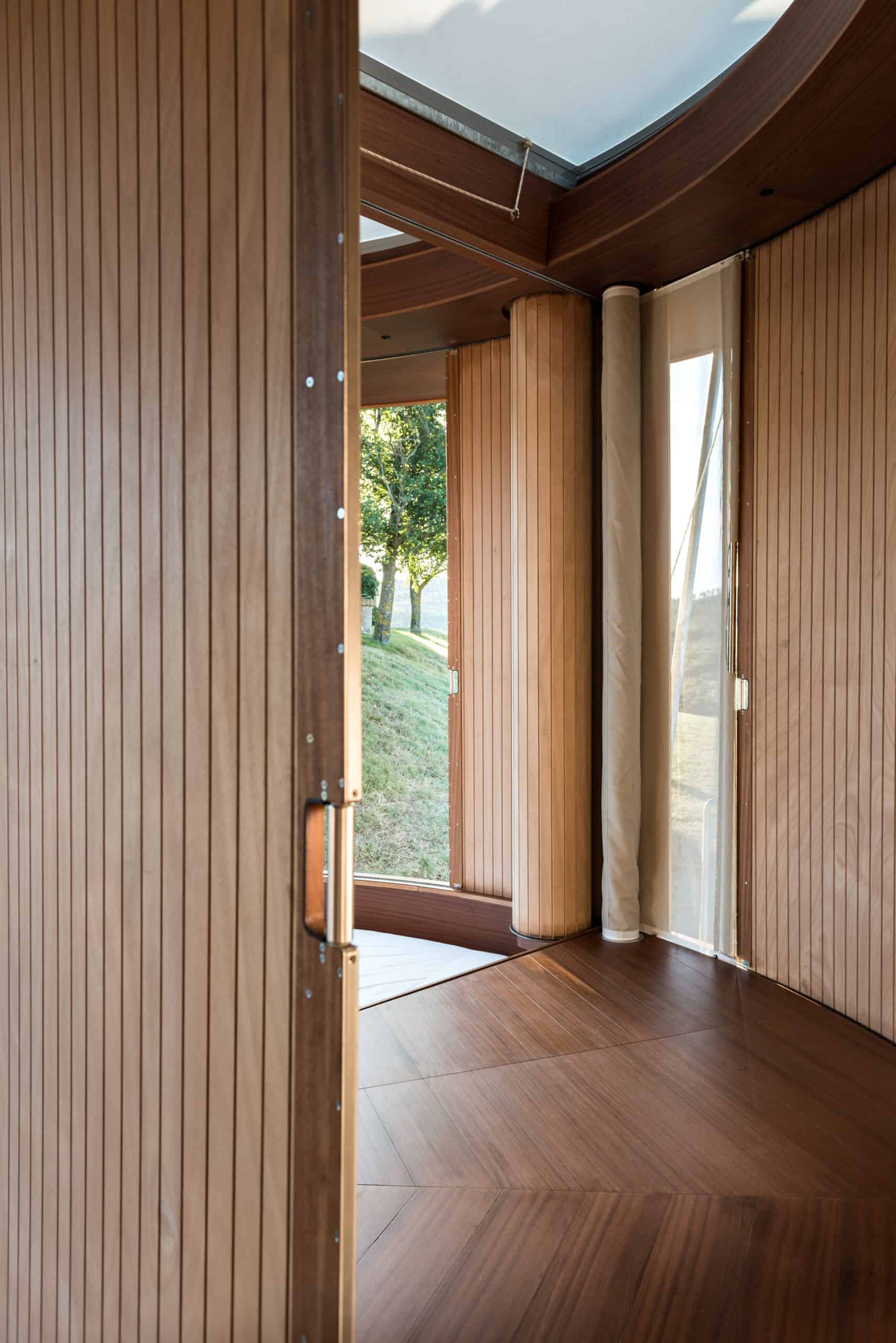 Le pareti interne possono essere avvolte attorno a un cilindro in legno di okumè e attraverso ingranaggi leonardeschi possono scivolare su binari invisibili, i letti e la toilette scompaiono attraverso botole, i mobili nascosti a filo del pavimento in mogano emergono solo all’occorrenza.