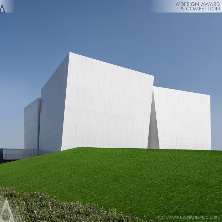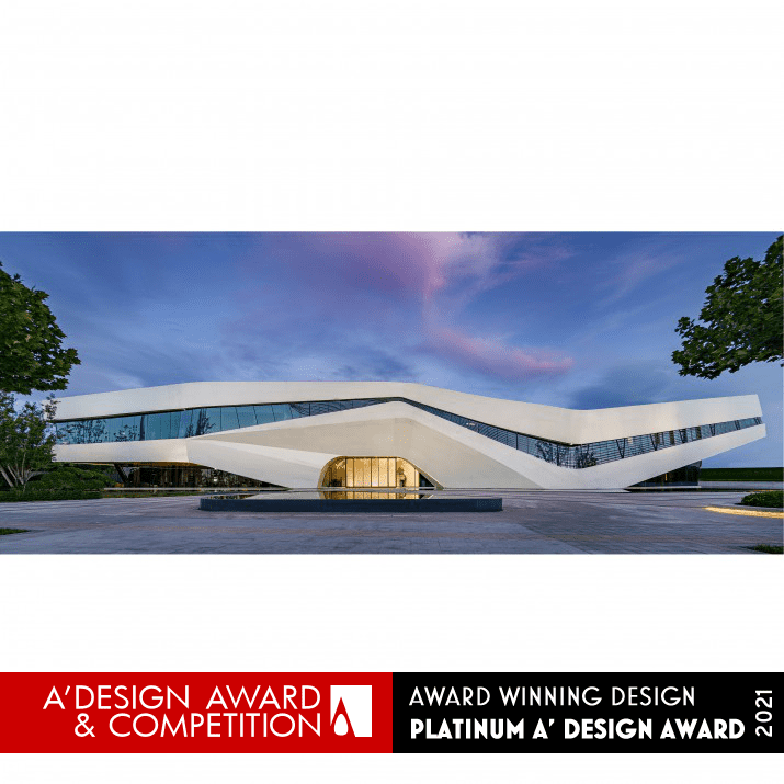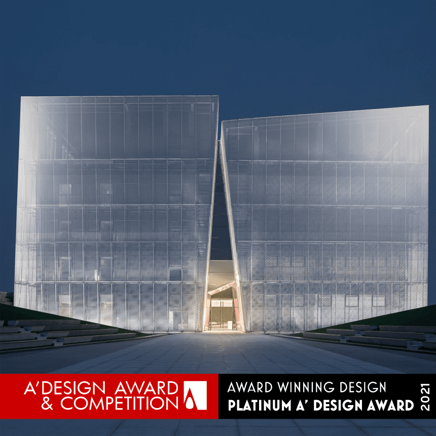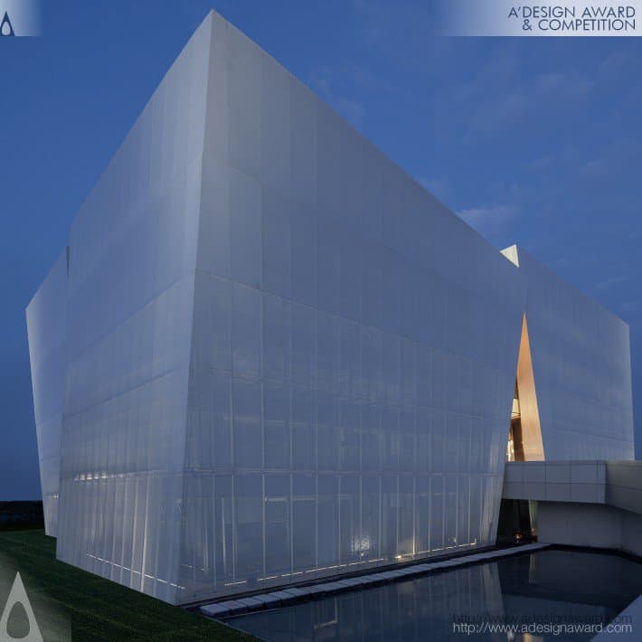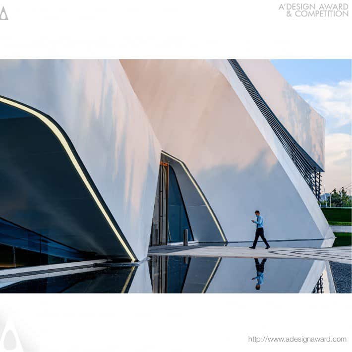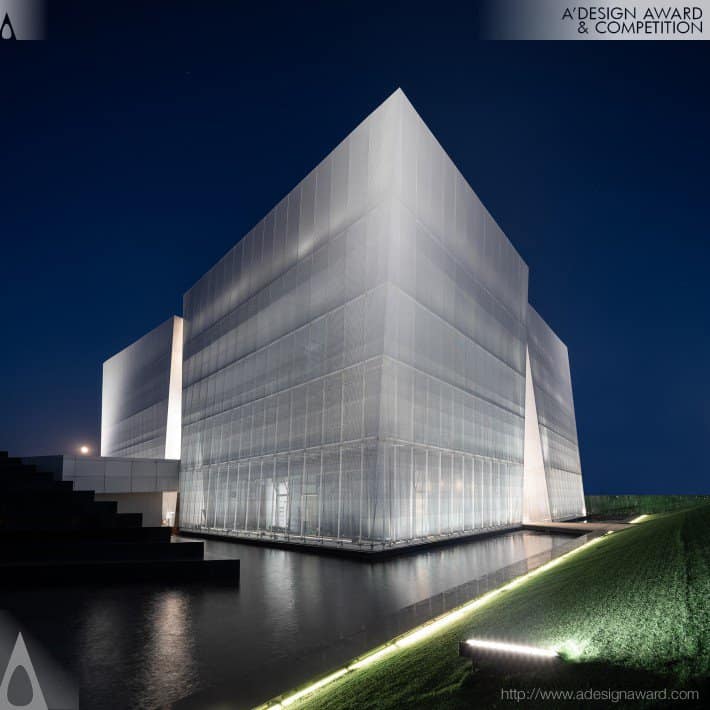 Un centro espositivo che si differenzia per la sua copertura: la lamiera forata è posta all’esterno della struttura principale, la densità della perforazione della lamiera cambia gradualmente dall’alto verso il basso in base alla funzione dell’interno dell’edificio per dare una maggiore o minore trasparenza.