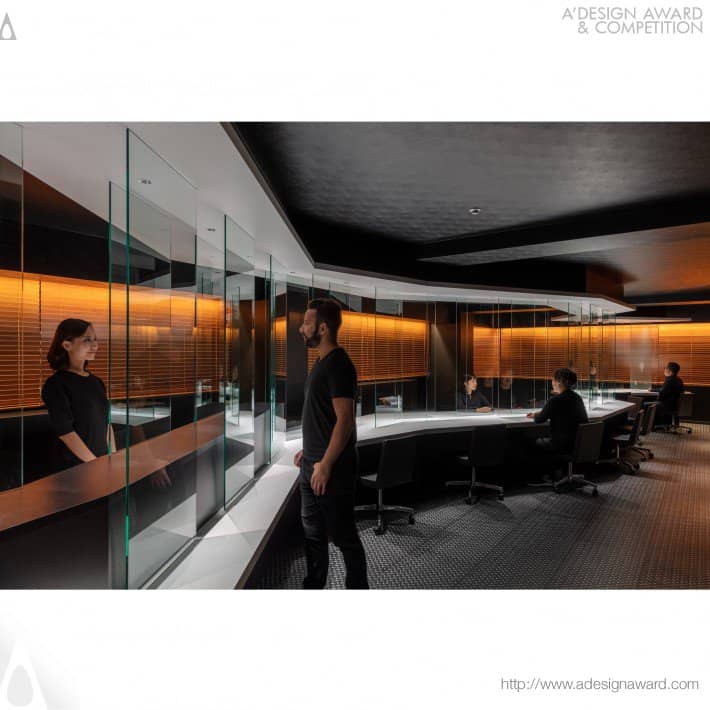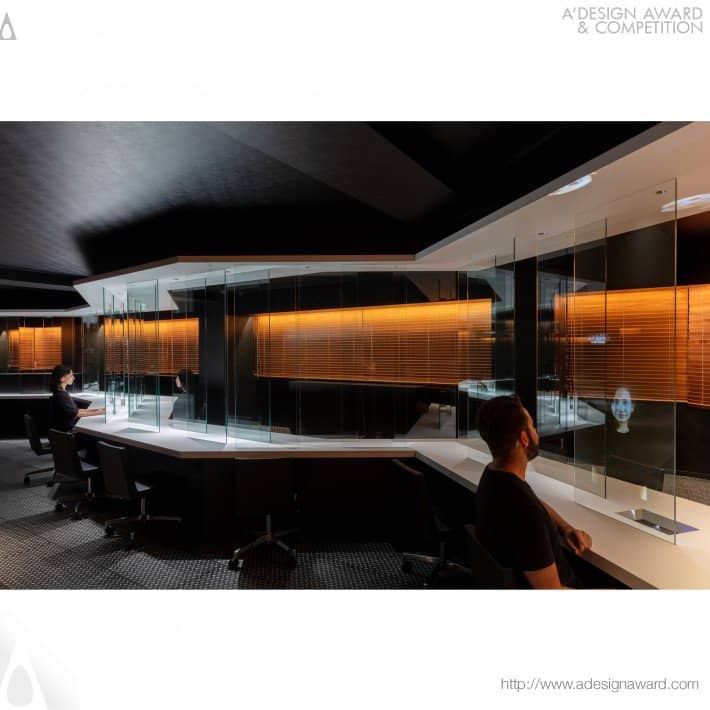 Lo spazio è evidenziato da un pannello a forma di fulmine che corre lungo l’ufficio separandolo in due entità attraverso una serie di schermi di vetro alternati lungo due linee parallele, proteggendo dalle gocce e consentendo la circolazione dell’aria e dei documenti.