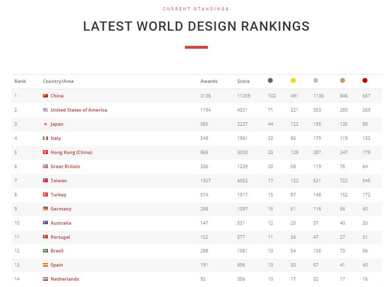 Si ottiene in questo modo una classifica che ogni anno viene aggiornata e che riporta la graduatoria delle varie nazioni del Mondo, i Paesi più premiati nel design per l’anno appena trascorso.