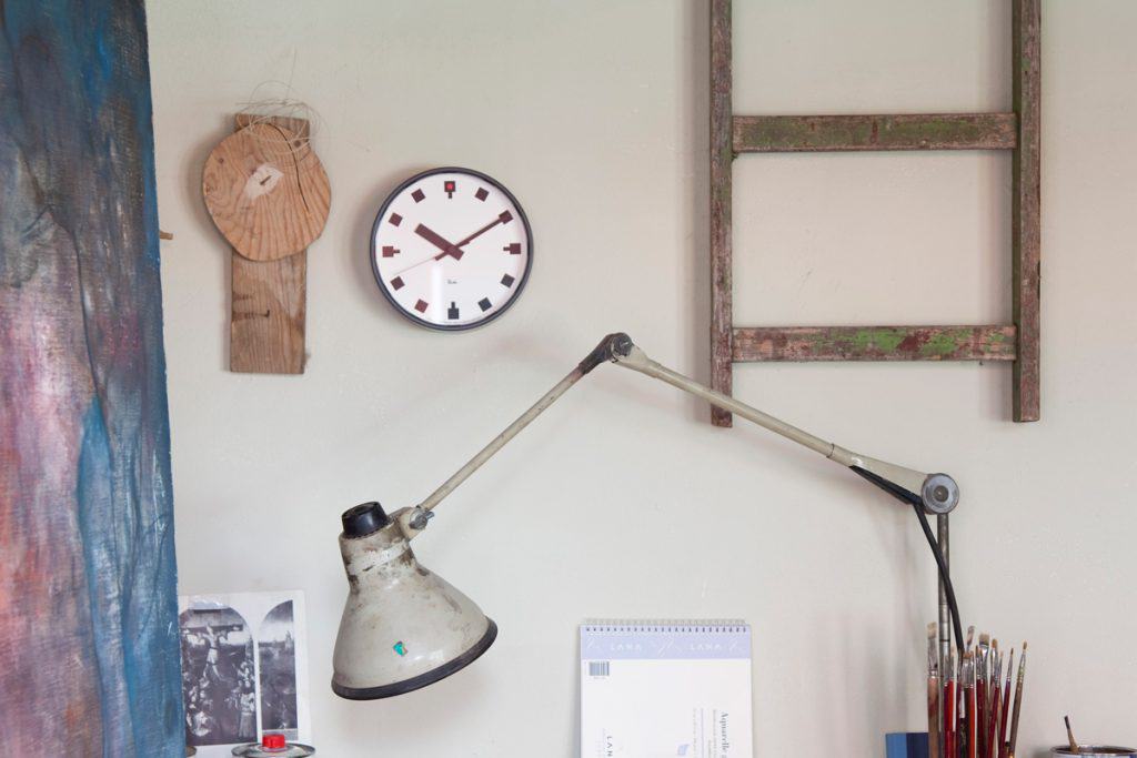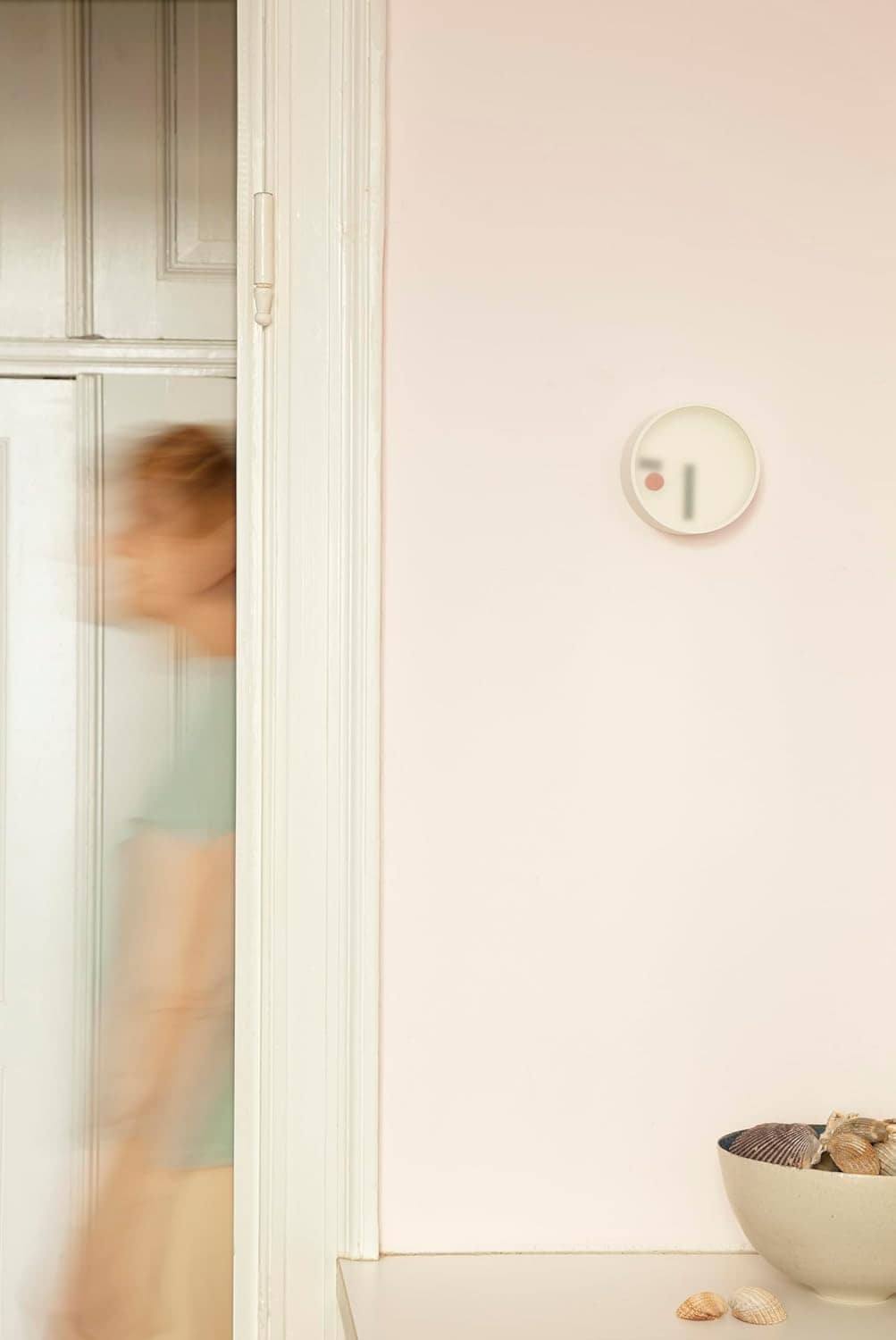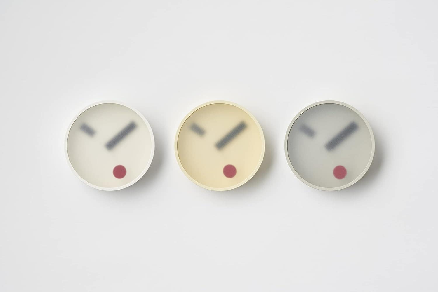 Il movimento delle lancette, poco visibile, trasmette dolcemente un segno ambiguo del tempo attraverso il vetro traslucido. È possibile scegliere tra tre colori, a seconda del materiale della parete, per far sì che si integri nello spazio e assomigli a un’insegna.