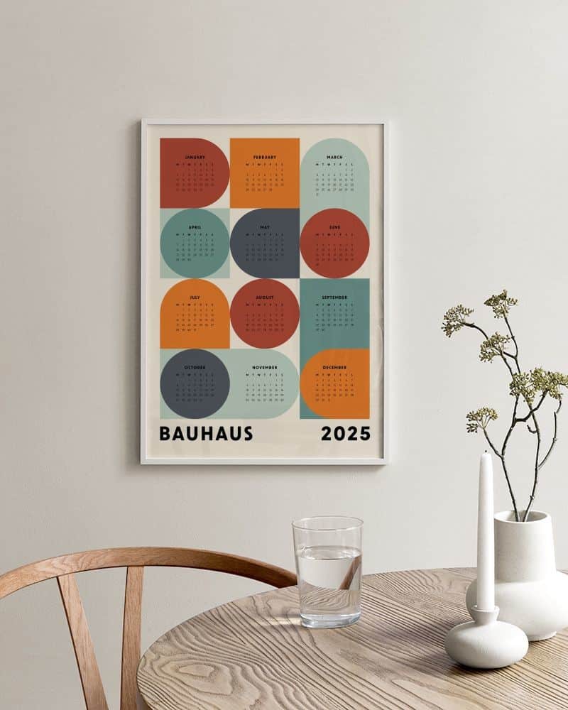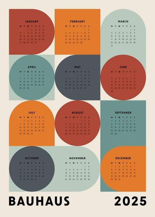 Questo calendario 2025 utilizza forme geometriche audaci in rosso, arancione, grigio e verde su uno sfondo beige chiaro.