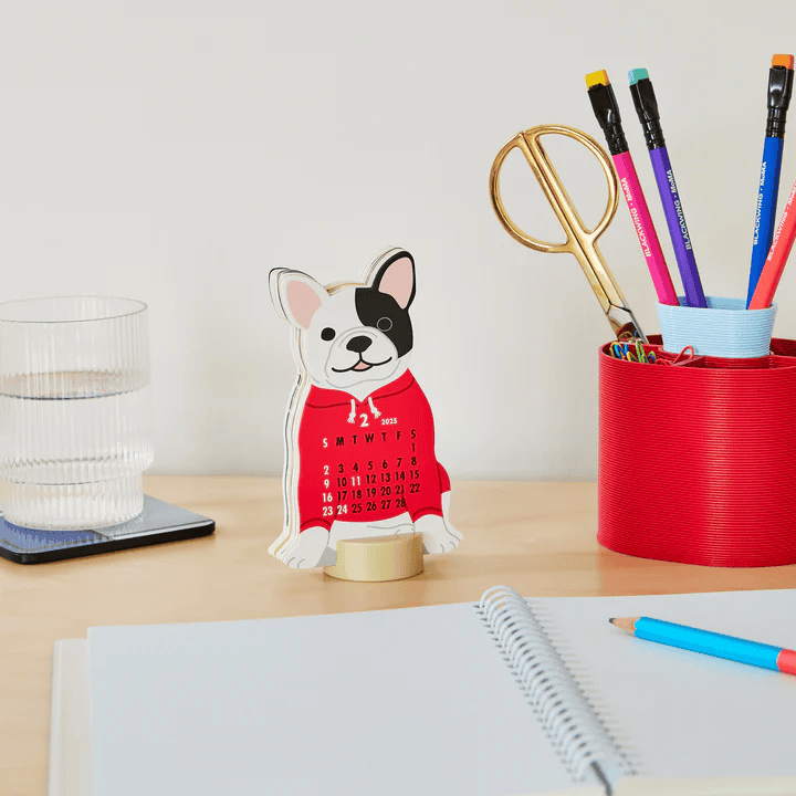Il calendario da tavolo 2025 3D French Bulldog comprende 12 graziosi calendari bulldog con una piccola base in legno.