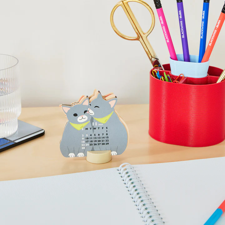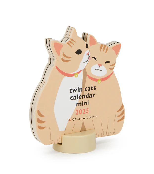 Il calendario da tavolo 2025 3D Twin Cats include 12 graziosi calendari a forma di gatto con una piccola base in legno.
