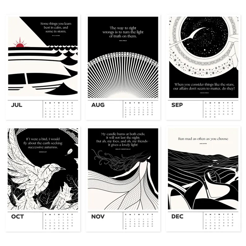 Un calendario poetico in bianco e nero, 12 citazioni di famose scrittrici donne accompagnate da immagini minimali, grafiche e allo stesso tempo suggestive.